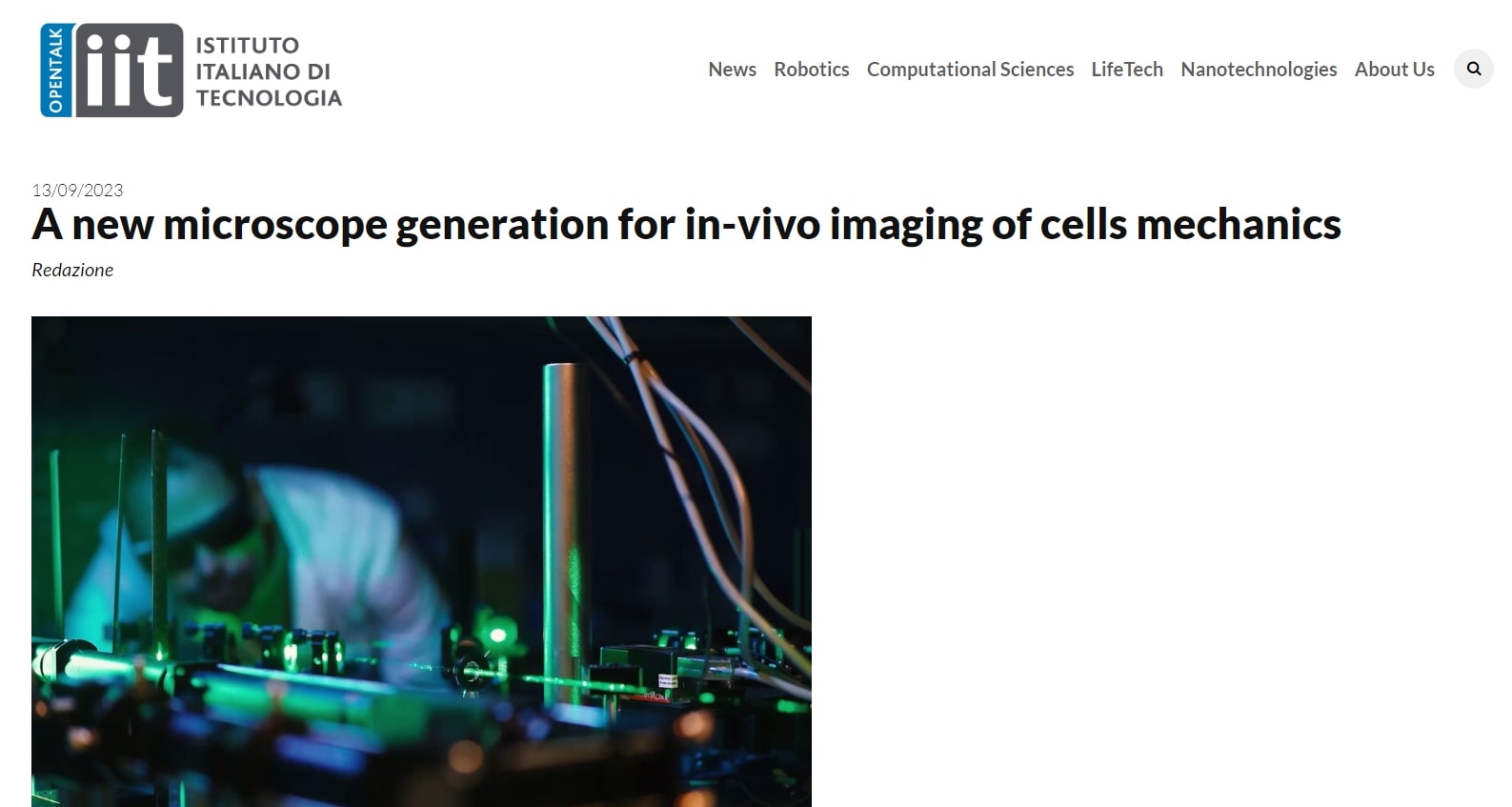 Genoa/Rome (Italy), 13th September 2023 – A tool that uses light to study biological molecules without interfering with their nanometric structure and that allows scientists to image basic living mechanisms with sub-millisecond acquisition time. It is the new generation microscope Micro4PAP, which is able to perform in-vivo imaging of the cell mechanical properties (rigidity, stiffness, viscosity), which is under development within the EU-funded project Micro4PAP led by the Istituto Italiano di Tecnologia (IIT-Italian Institute of Technology). The new device will be able to perform state-of-the art in vivo images of cells and tissues mechanics, facilitating the understanding of physiologic as well as pathologic processes, such as those involved, for example, in the neurodegenerative and neurodevelopmental diseases.